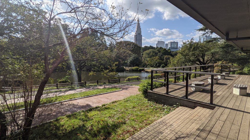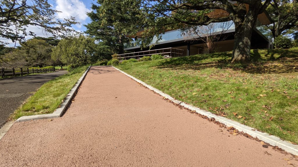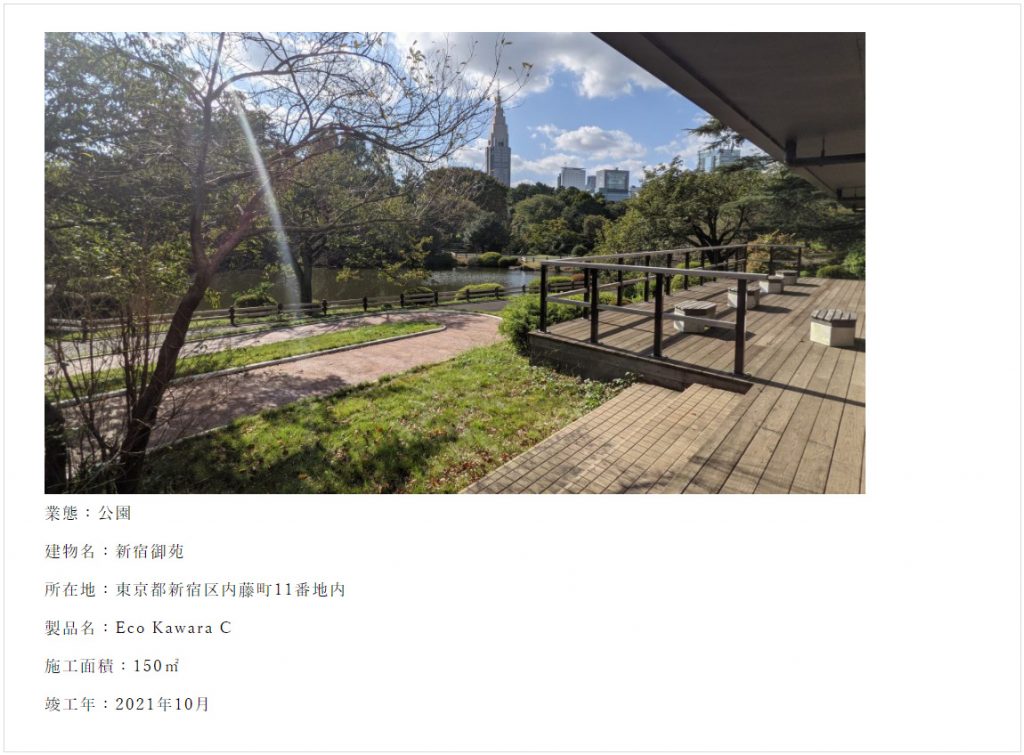 今回の最新情報では、Eco Kawara 透水性舗装を使用した最新の施工実績をご紹介します。2021年10月に竣工した、新宿御苑 スターバックスコーヒージャパン前 芝生広場バリアフリー等整備工事です。
