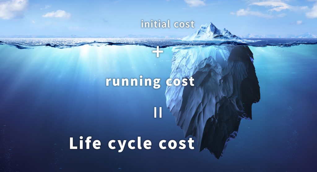 その問題を可視化するために注目されているのがライフサイクルコスト(以下LCC)。LCCはよく氷山にたとえられます。水面から出ている部分をイニシャルコスト(初期費用)などの建設費とすると、最初に目にしたときに非常に大きく感じますが、実は全体に占める割合としては意外に小さいというものです。むしろ建築直後から発生するランニングコスト(運用費用)などの改修・修繕工事を含むその後のランニングコストの方が、ライフサイクルコストに占める割合は大きいといわれています。