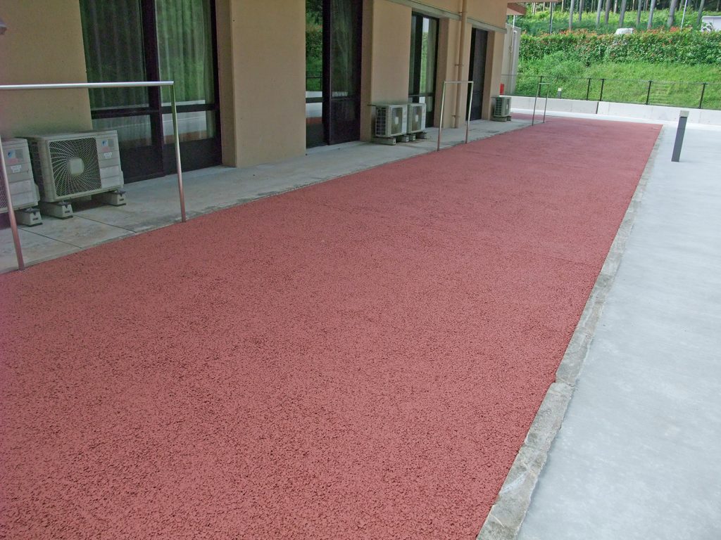 「Eco Kawara 透水性舗装」は、建築物の建替え等で発生する瓦の廃材を粉砕し骨材にした常温塗布式薄層舗装材 ・保水性も高く、滑りにくい舗装です。
