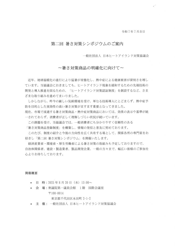 このたび、日本ヒートアイランド対策協議会では【令和7年(2025年)8月20日(水)】に、