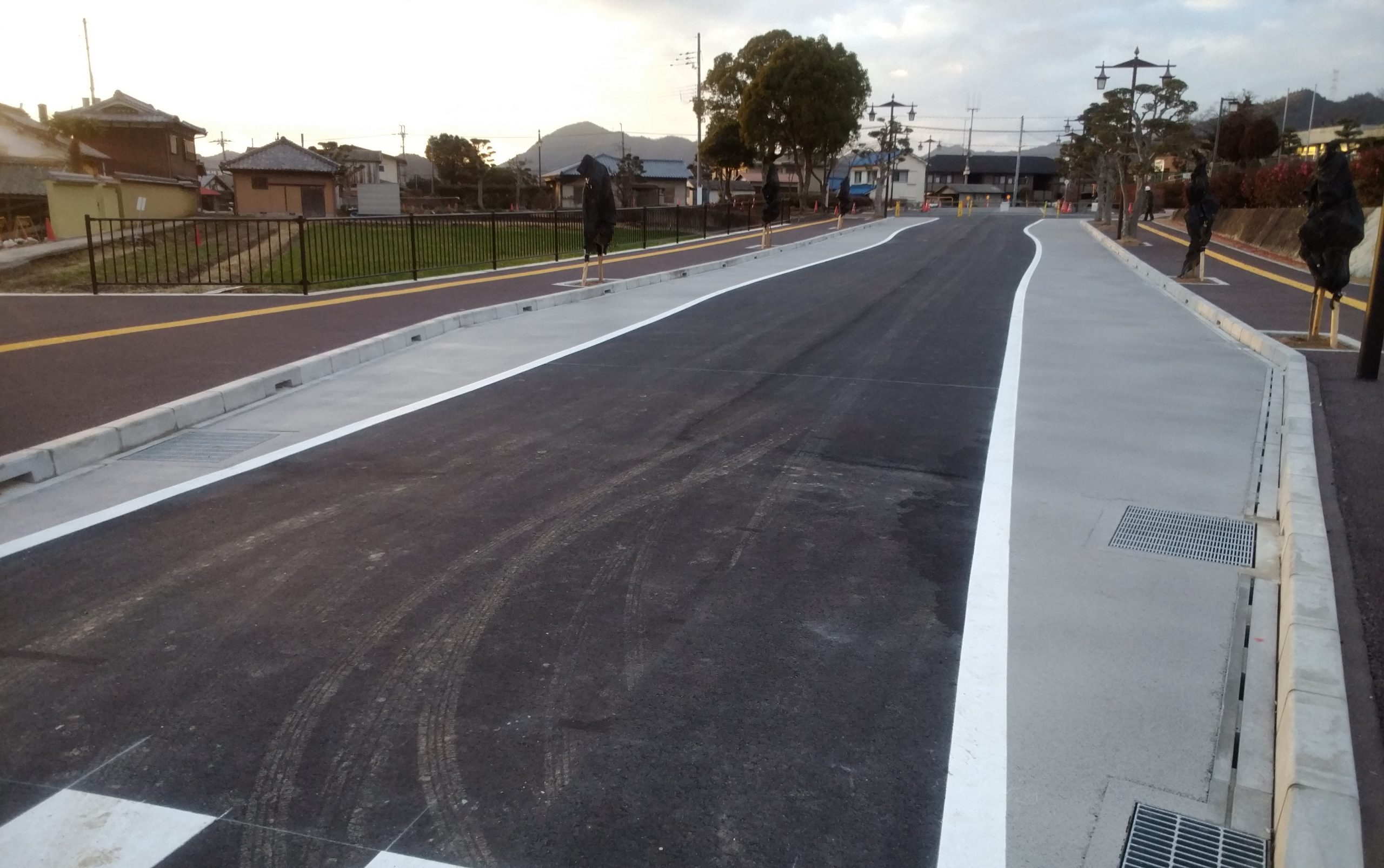 このメインストリートの歩道と車道に、「Eco Kawara コート」と「Eco Kawara スーパーコート」を施工しました。