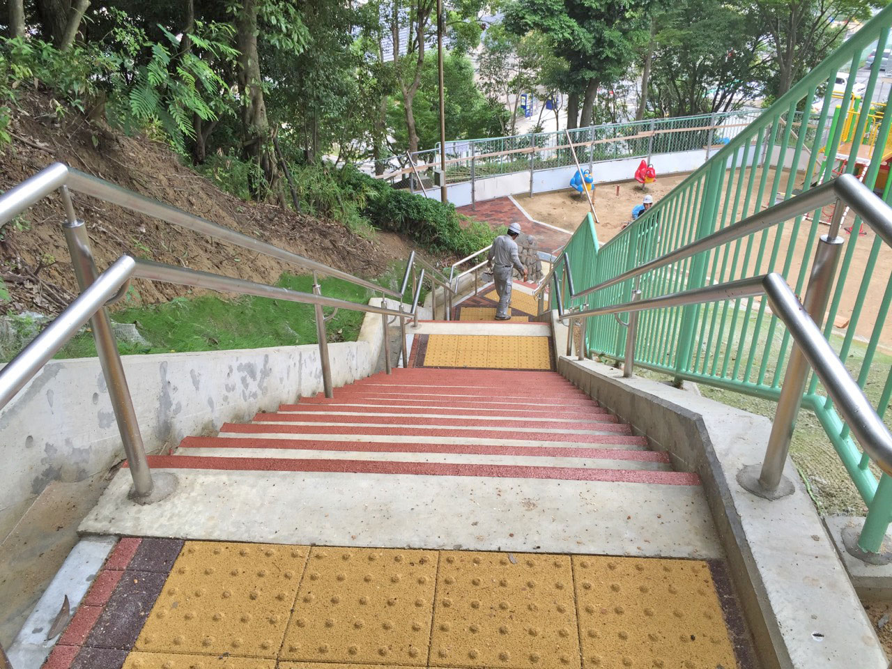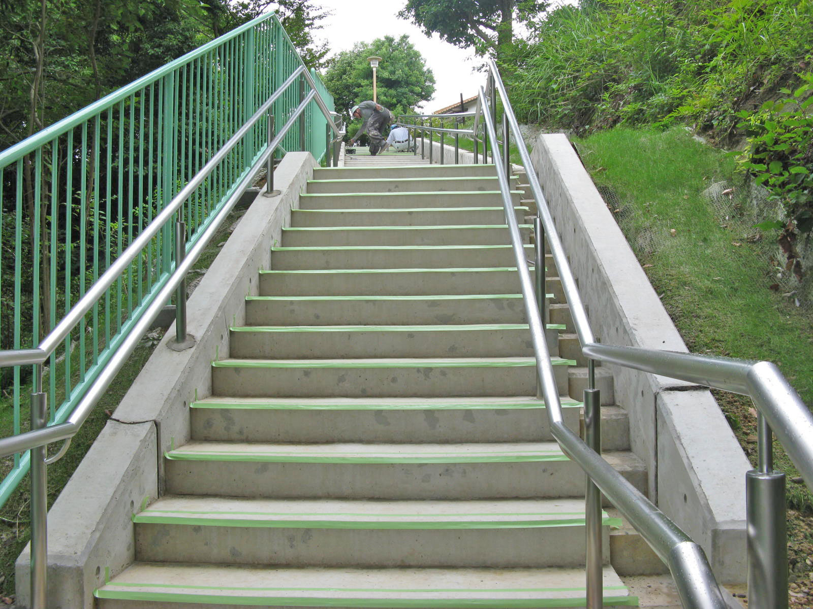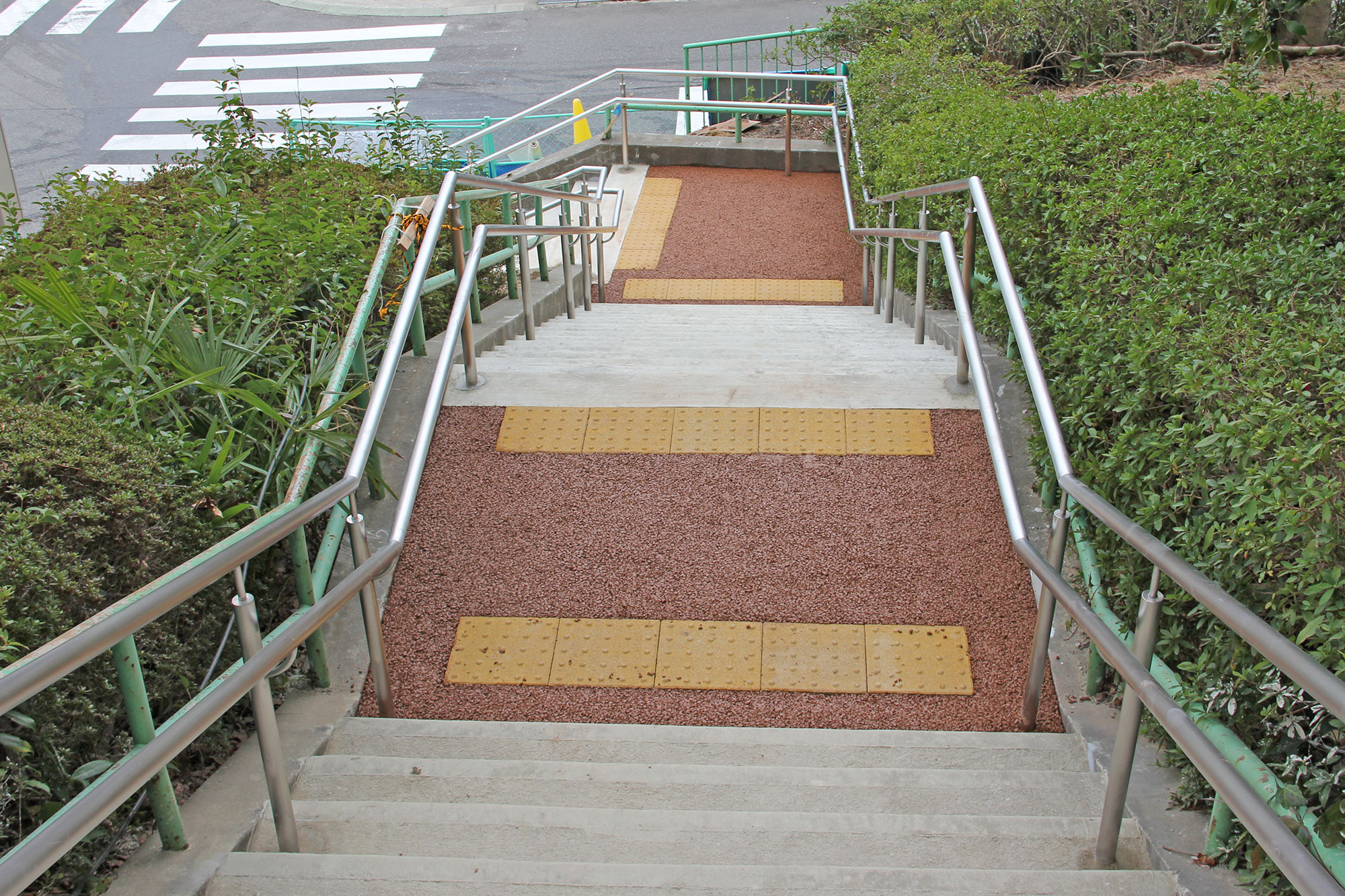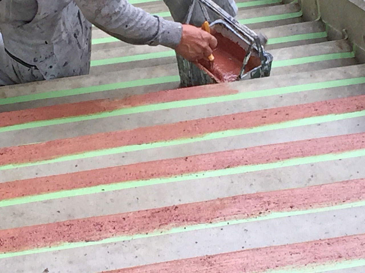 滑り止め舗装として階段段鼻部に「Eco Kawara コート」を施工。